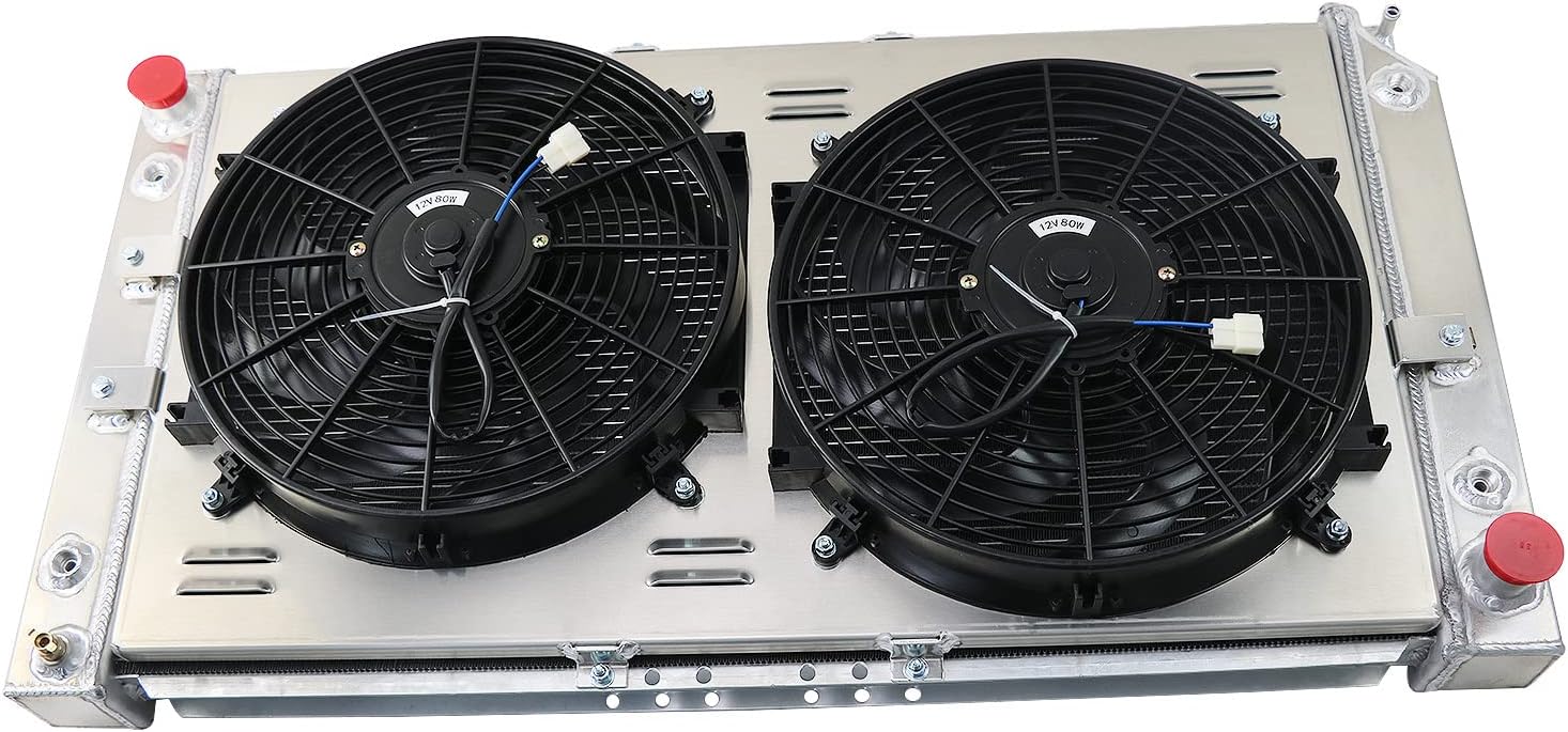 This AA5052 Aluminum Radiator is designed to provide maximum cooling efficiency to prevent premature engine failure Its light-weight, and high-heat transferring aluminum features a tube and fin design that, dramatically increases surface area that enables the heat to dissipate more efficiently This AA5052 Aluminum Radiator is at least 30%-45% more efficient than stock ones Most importantly, it has a much higher capacity for coolant than stock ones, which means that your cooling system will be more efficient and will be more resistant to temperature surges in racing applications AA5052 Aluminum Shroud+Fan: The fan and the fan shroud effectively drive the heat over and out the engine compartment rather than thrusting it into the front of the engine The fan shroud basically houses the fan blades securing it in place and keeping it from damaging the other engine components that may disturb the smooth and even operation of the engine With excellent operating temperature management, allowable levels of engine temperature are stabilized Investing in proper maintenance though will considerably benefit the ride and driving quality in maintaining the ideal working conditions of the engine This Radiator Compatible with: Compatible with 1994-1996 B-uick Commercial Chassis 5.7L V8 Compatible with 1994-1996 B-uick Roadmaster 5.7L V8 Compatible with 1994-1996 C-adillac Commercial Chassis 5.7L V8 Compatible with 1994-1996 C-adillac Fleetwood 5.7L V8 Compatible with 1994-1996 Chevy Caprice 5.7L V8 Compatible with 1994-1996 Chevy Impala 5.7L V8 Other part Numbers: 2395, 2396, RADS1517, KKS1517 Radiator Specs: High Performance Racing Spec. 3-Row of tubes Core Racing Design Inlet Hose Connection: Driver Side Outlet Hose Connection: Passenger Side Core Material:Full Aluminum Tank Material: All Aluminum Transmission Oil Cooler: Passenger Side Engine Oil Cooler: Driver Side Flow Type: Crossflow Crafts: 100% Tig welded Fitment Type: Direct Replacement Petcock Drain: OEM style brass petcock drain Radiator Cap: No Please Check the Size Before You Buy! Fan Details: Maximum Fan CFM: 1730 cfm Fan Diameter (in): 14.050 Thickness (in): 2.500 Number of Blades: 8 blades Maximum Fan RPM: 2,250 rpm Blade Material: Plastic Amp Draw: 12.70 amps Includes the Mounting Tabs for an Easy Zip Tie Installation Thermostat Kit: Universal fit for any automotive vehicle and electric fan Activates by grounding electric fans at preset temperature 180'F turn-on temperature, 165'F turn-off temperature 3/8" NPT thread-in brass probe Probe typically threads into radiator, water outlet or manifold Thermostat Relay Kit Instructions: RED + connect directly to battery WHITE wire to ignition switch power source BLACK goes to thermos switch BLUE wire goes to the Fans This set up will run Fans & pull air in through radiator Product Includes: 1 X 3-Row AA5052 Aluminum Radiator 1 X AA5052 Aluminum Shroud 2 X 14inch Fans (Includes mounting kits) 1 X Thermostat Relay Kit PLS check core/overall/inlet/outlet SIZE carefully before you order Contact us if you have any question about our product PLS Note: If need 3-row radiator without fan ASIN is: B0B7N57MMH