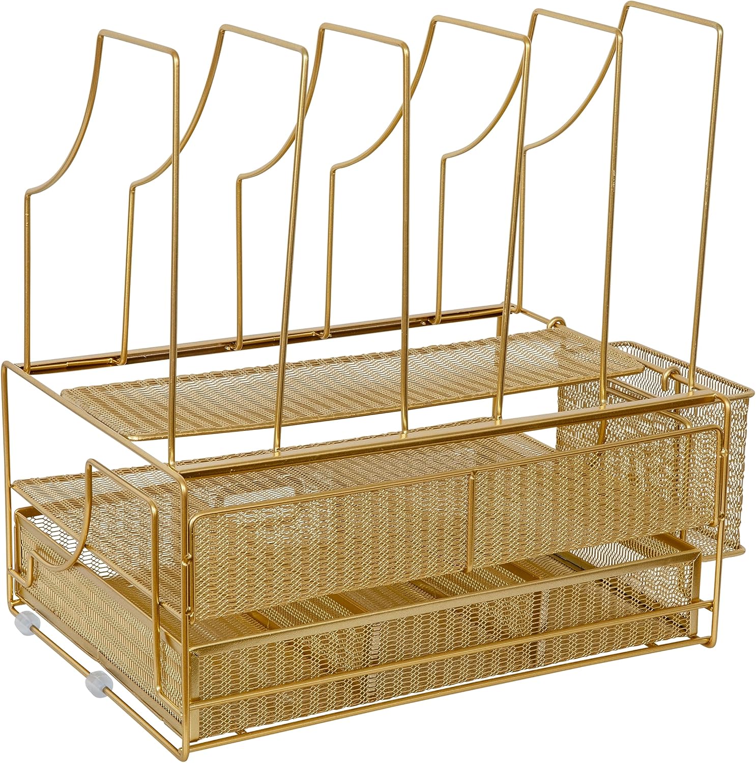 When your work at home tasks demand a great deal of your time, the Martha Stewart Desktop Organizer with Storage Drawer will ensure your work space is organized and inspiring. Satisfying environmental cues can direct your energy toward productivity, creativity, and staying on task by keeping essential items organized, tidy, and within reach. This metal mesh organizer serves multipurposes by providing you with an attractive and efficient workspace that keeps your important files and office supplies sorted and organized in one place.