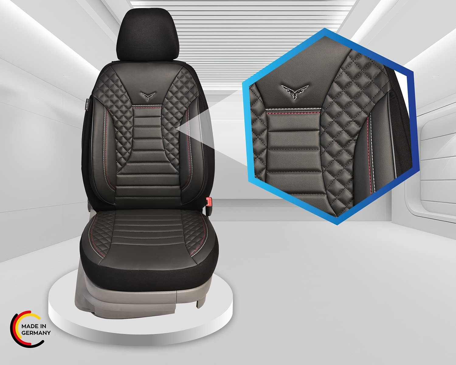 Premium velour faux leather seat covers for your vehicle. Box contents: 1 x single seat cover (2 pieces) for drivers. 1 x single seat cover (2 pieces) for passenger. 2 x headrest covers. Easy to install with Velcro system (backrest). Also suitable for active headrests (not removable headrests). Suitable for airbags and seat heating. The back of the front seats are equipped with generous pockets. Driver and passenger seat cover orthopaedic and sporty as shown in the picture. For a better and comfortable seating experience, the sides are additionally lined Made of high quality fabric from the automotive industry. Distinctive beautiful design. Washable at 30°C. Logo and colours may vary slightly.